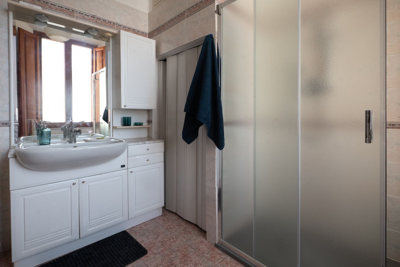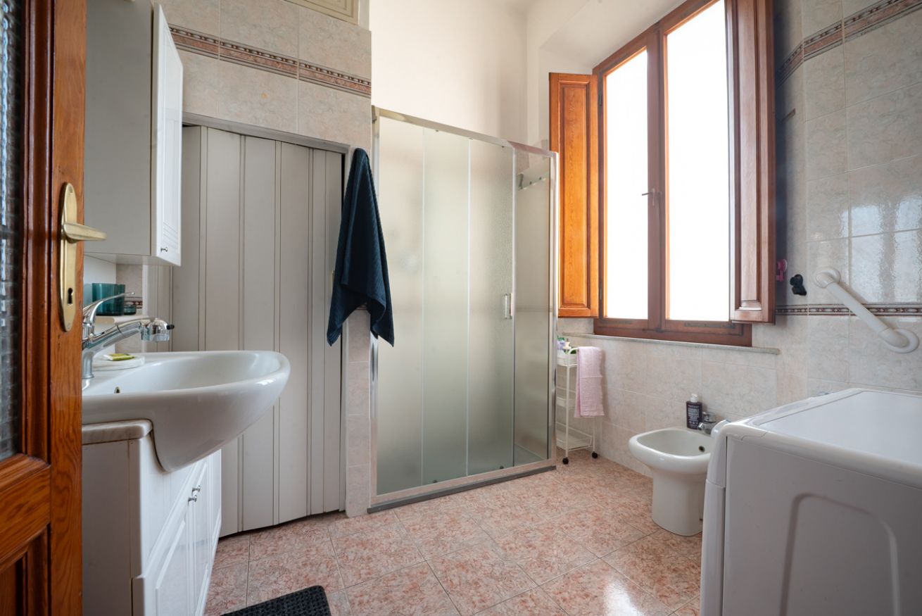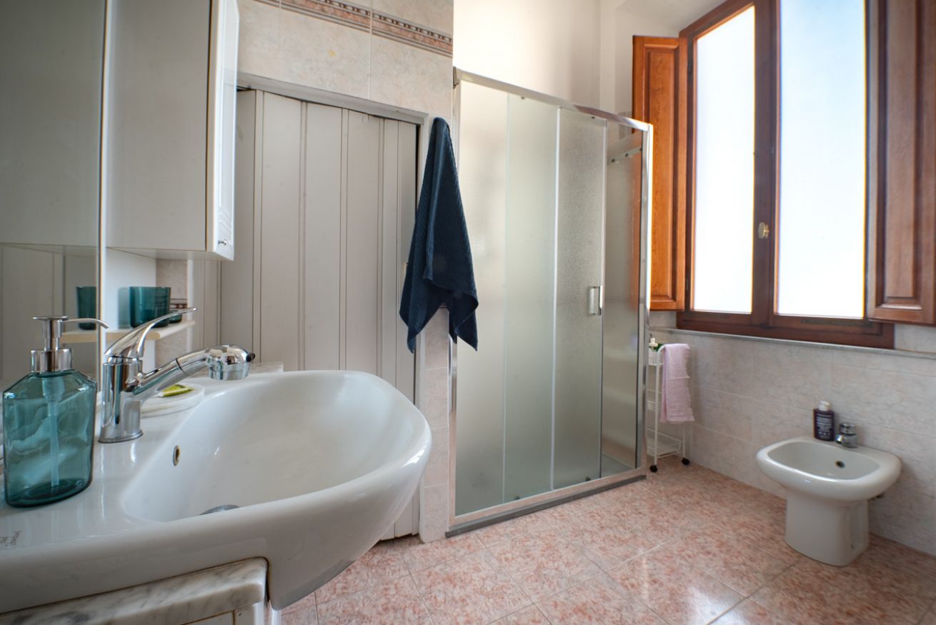 Ampio e funzionale, con doccia, lavabo, WC e bidet. E' presente la lavatrice